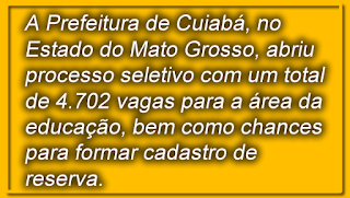 \A Prefeitura de Cuiabá, no estado do Mato Grosso, abriu processo seletivo com um total de 4.702 vagas para a área da educação, bem como chances para formar cadastro de reserva. Com salários de R$ 1.045,84 a R$ 3.111,97, os novos profissionais farão jornadas de 30 horas semanais.